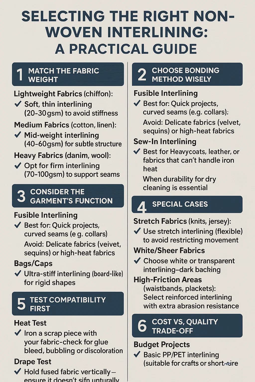 Fabraicí troma (denim, olann): roghnaigh idirghabháil daingean (70-100GSM) chun tacú le seams agus imill.