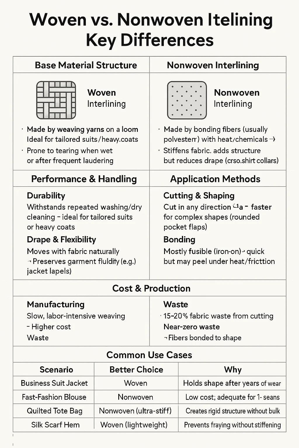 Nonwoven: Gearr in aon treo → níos tapúla le haghaidh cruthanna casta (m.sh., flapaí póca cruinn).