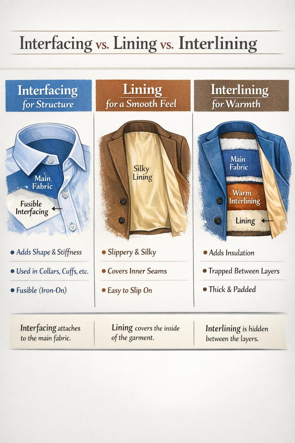 Tá interlining cosúil le "ciseal ceapaire," tríú ciseal idir an príomh-fabraic agus an líneáil.