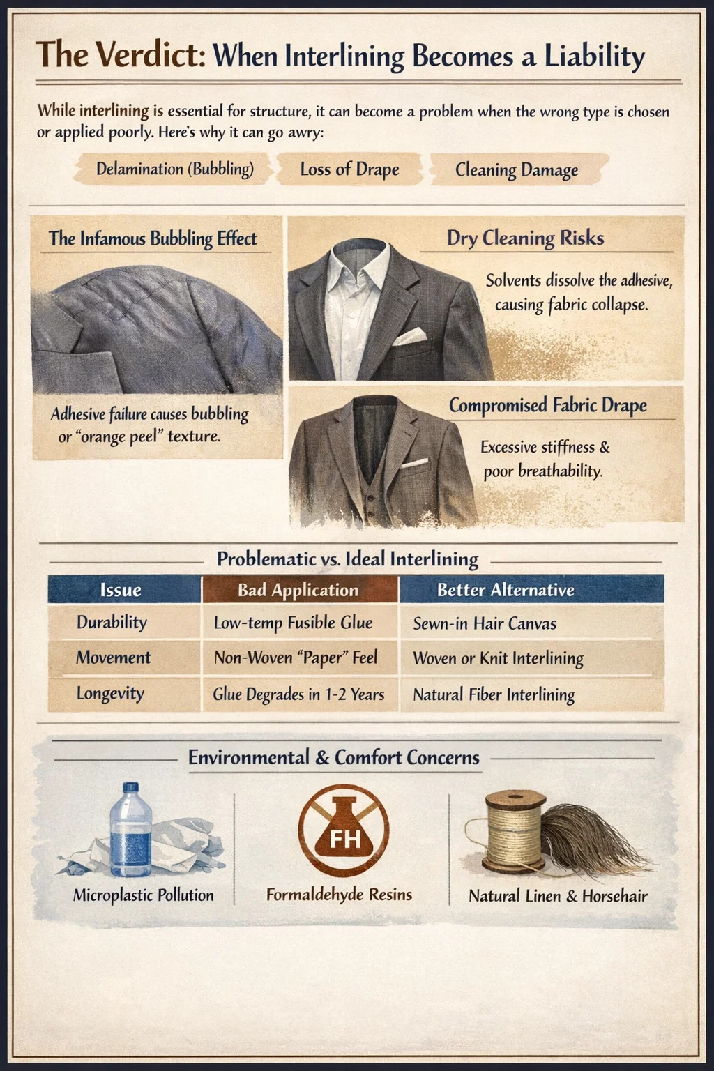 Chun a bheith soiléir, idirlinne nach bhfuil go bunúsach dona ; go deimhin, tá sé riachtanach le haghaidh struchtúr. Mar sin féin, bíonn sé "olc" nuair a roghnaítear an cineál mícheart nó nuair a chuirtear i bhfeidhm go dona é. Áirítear ar na príomhchúiseanna a bhféadfaí idirlinne ar leith a bheith díobhálach d’éadaí delamination (boilgeog) , a caillteanas drape nádúrtha , agus frithghníomhartha díobhálacha ar ghlanadh . Nuair a theipeann ar an nasc idir an idirlinne agus an fabraic aghaidh, cruthaíonn sé damáiste buan aeistéitiúil nach féidir a aisiompú.